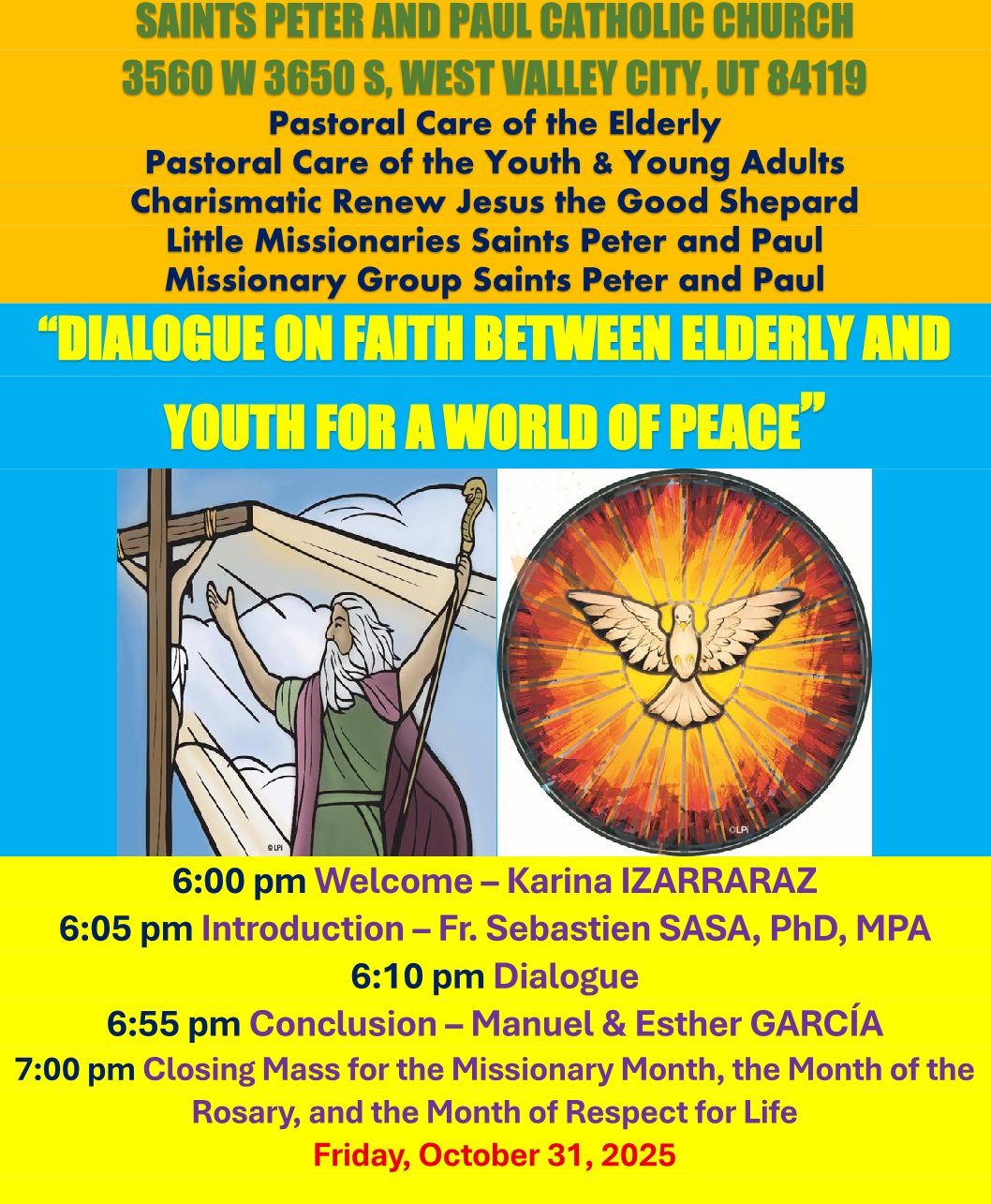 Vào cuối Tháng Truyền giáo, Tháng Mân Côi và Tháng Tôn trọng Sự sống, các mục vụ và nhóm mục vụ sau đây (Chăm sóc Mục vụ Người cao tuổi, Chăm sóc Mục vụ Thanh thiếu niên & Thanh niên, Canh tân Đặc sủng Chúa Giêsu Mục tử Nhân lành, Dòng Thánh Phêrô và Phaolô, Nhóm Truyền giáo Thánh Phêrô và Phaolô) sẽ tổ chức một BUỔI ĐỐI THOẠI VỀ ĐỨC TIN giữa các bậc cao niên và giới trẻ trong cộng đồng giáo xứ chúng ta, nhằm xây dựng một Thế giới Hòa bình. Đây là một khoảnh khắc quan trọng của ĐỐI THOẠI ĐỨC TIN LIÊN THẾ HỆ. Chúng tôi thực hiện điều này trong khuôn khổ của Chương trình Đào tạo Đức tin Toàn diện.